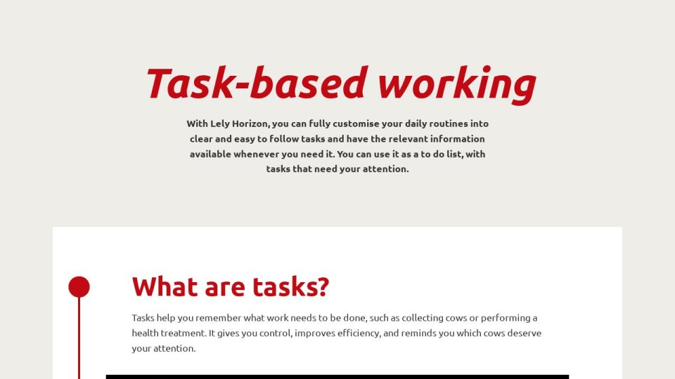 With Lely Horizon, you can fully customise your daily routines into clear and easy to follow tasks and have the relevant information available whenever you need it. You can use it as a to do list, with tasks that need your attention.