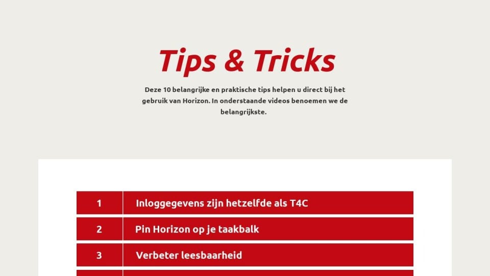 Deze 10 belangrijke en praktische tips helpen u direct bij het gebruik van Horizon. In onderstaande videos benoemen we de belangrijkste.